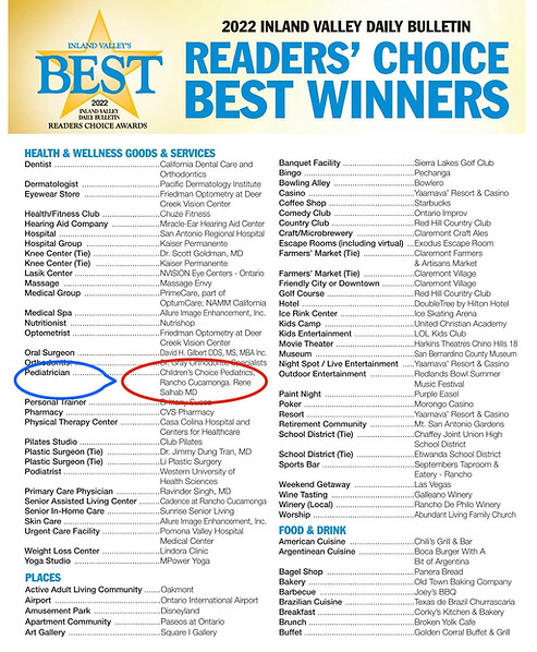 Voted Readers' Choice BEST Pediatrician of the Inland Valley!